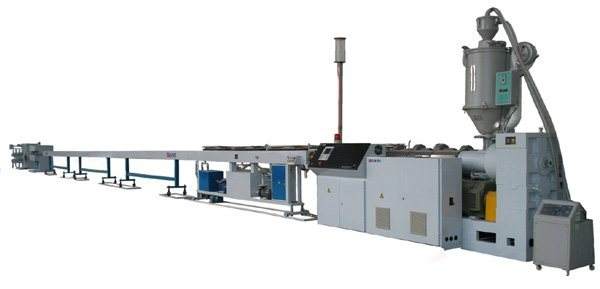 该生产线由采用德国制造,采用挤出机、配以高扭力减速箱、新型开槽机筒、LTM螺杆、挤出量大、物料熔温低、真正实现低温塑化。机头模具为螺旋分流式机头或篮式机头,可配静态混炼系统,内部压力分布更均匀。真空定径箱为两段式,完善的水温、水位以及流量控制,确保生产出高质量的管材。生产线稍作变化,配不同模具、螺杆及附属设备,可生产PE、ABS、PERT、REX-B管以及两种不同材料的塑料复合管。同时根据PPR、PPB的加工性能设计制造的挤出机,配以进口减速箱、新型开槽机筒、BM螺杆,挤出量大,物料熔温低,节能效果显著。螺旋分流式机头,可配静态混炼系统,料层彼此充分叠加,与传统支架式模头相比较,内壁压力分布更均匀。特殊设计的真空定径和冷却系统,水槽不锈钢板制作,采用多段式水模冷却,确保高速生产厚壁管及大口径管的要求。