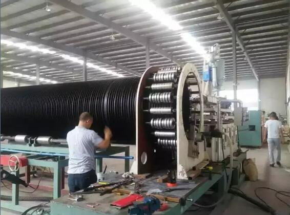3. 热态缠绕成型熔缝质量高,从挤塑机口模挤出的处于熔融状态的平料带和包覆料带,按预定的位置均匀的缠绕在加热的滚筒模具上,保证了结构壁管熔接缝质量,管材采用风冷却,材料冷却均匀。特别是结构设计中平料带的熔接缝被料带包覆支撑管所覆盖,提高了制品整体的抗外压能力。 管材的水平层与加强结构层在熔融状态下熔接,熔缝质量高,没有内应力,管材的整体强度高。